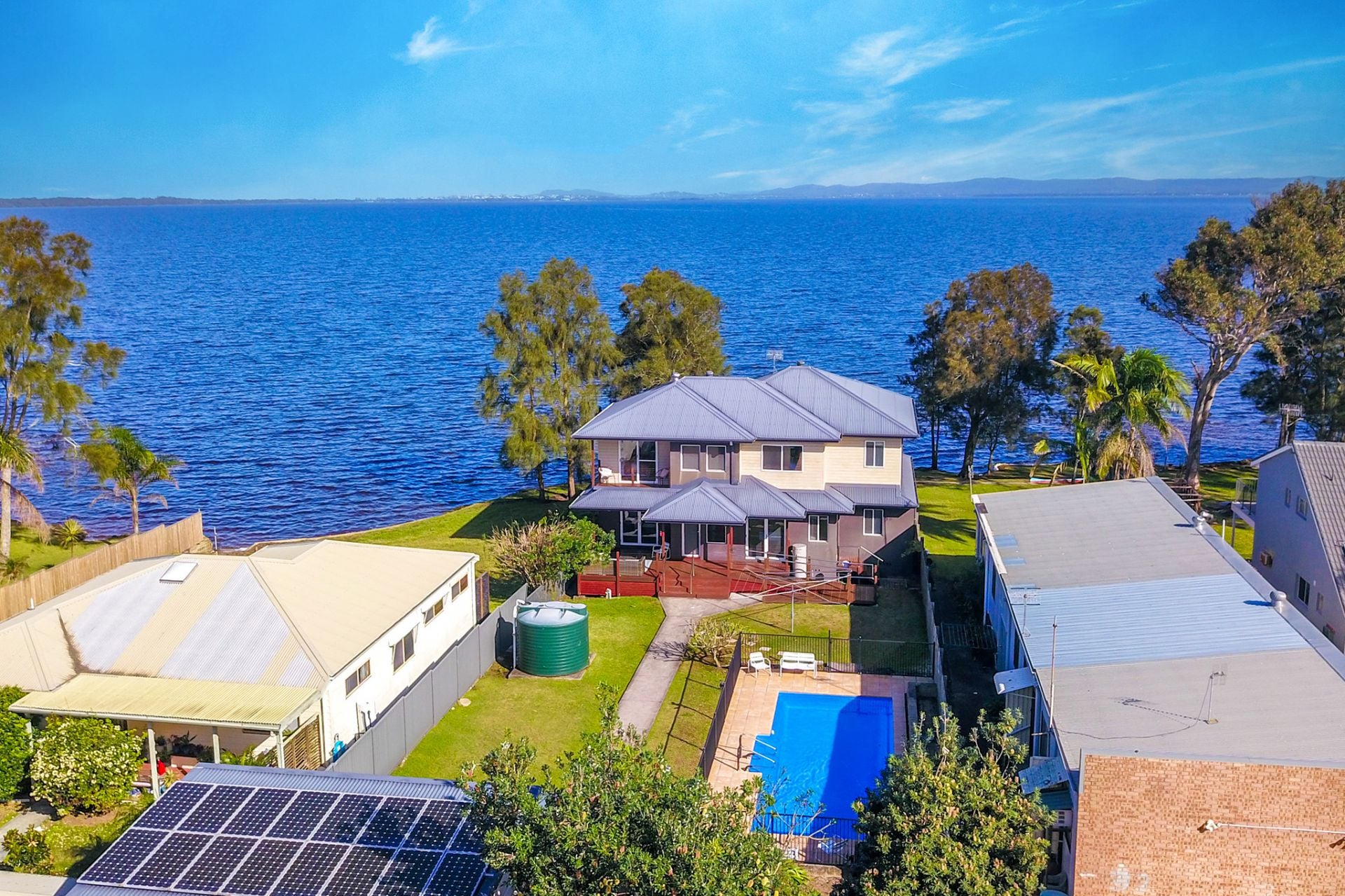 Tucked away from the street & set on a sprawling 1,290m² parcel of absolute waterfront land, this exceptional residence offers an enviable lifestyle with uninterrupted 180-degree views over the beautiful Tuggerah Lake. Designed for comfort and versatility, this spacious four-bedroom home combines modern elegance with timeless style.