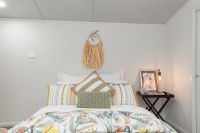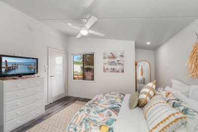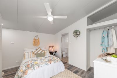Large master bedroom with built in wardrobe and ceiling fan.